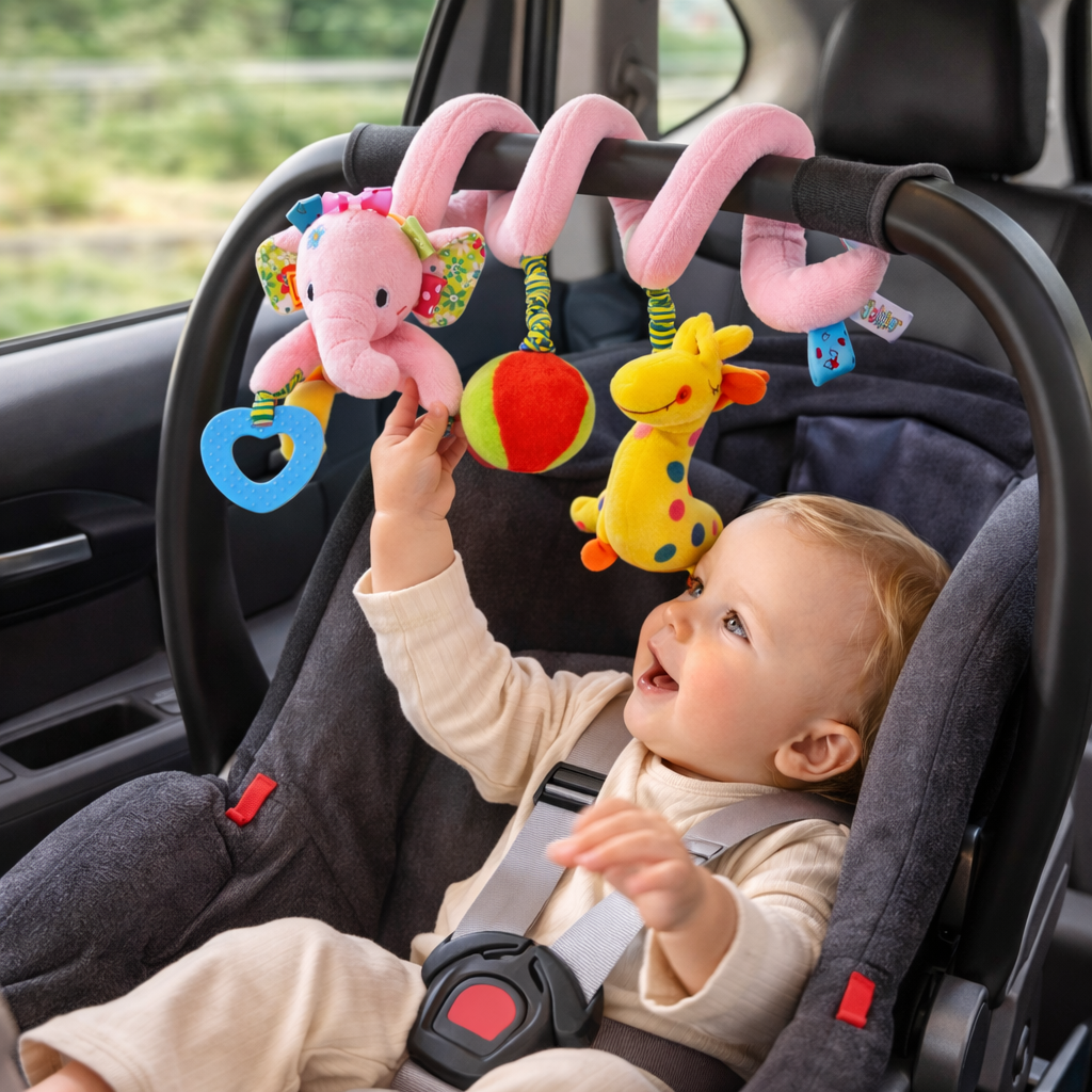 Keep little hands busy and curious with this Baby Activity Spiral Hanging Toy, designed for everyday sensory play at home or on the go. The soft spiral wrap makes it easy to attach to a pram, cot rail, carrier, or car seat handle, while the hanging plush shapes give baby something fun to reach for and explore.