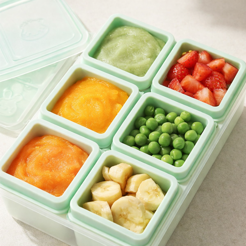 The tray features six individual cubes to help portion food neatly.